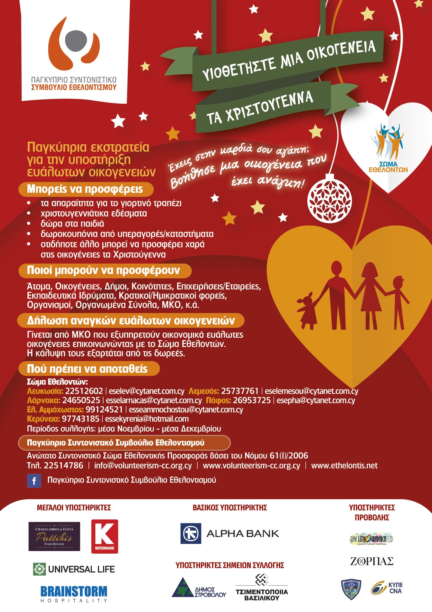 December 10, 2023Το ‘‘Κυπριακό Δίκτυο Δικαιοσύνη για Όλους’’ ΚΔΔΟ ως εγγεγραμμένο μέλος του Παγκύπριου Συντονιστικού Συμβουλίου Εθελοντισμού (Αρ. Μητρώου 495/01/Π/2023) συμμετέχει στην παγκύπρια εκστρατεία ‘‘Υιοθετήστε μια Οικογένεια τα Χριστούγεννα’’, η οποία πραγματοποιεί για 10η συνεχή χρονιά από το Παγκύπριο Συντονιστικό Συμβούλιο Εθελοντισμού.